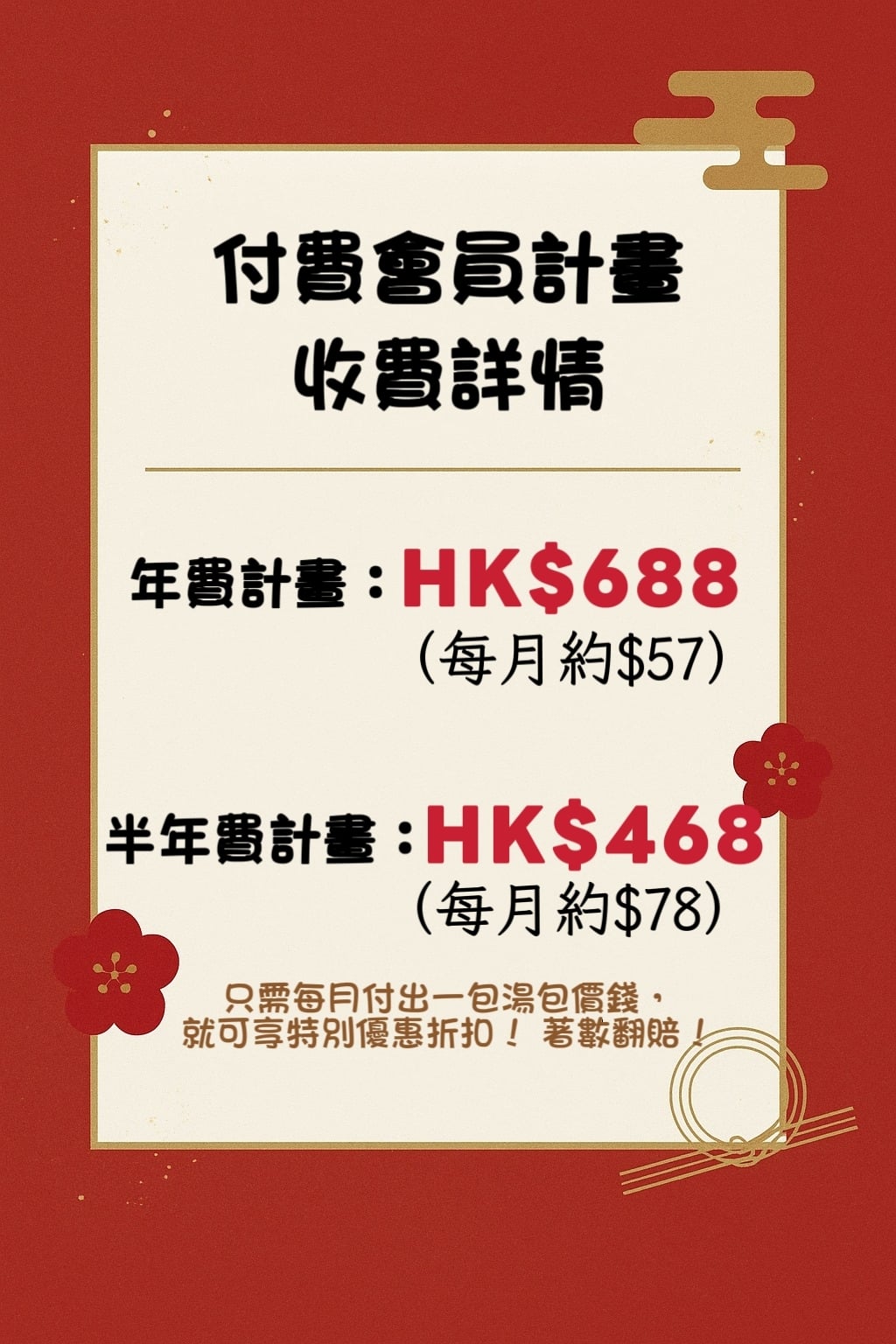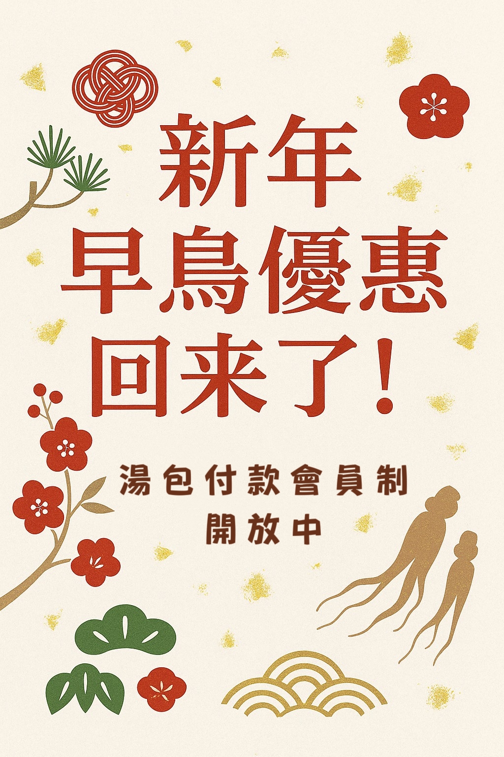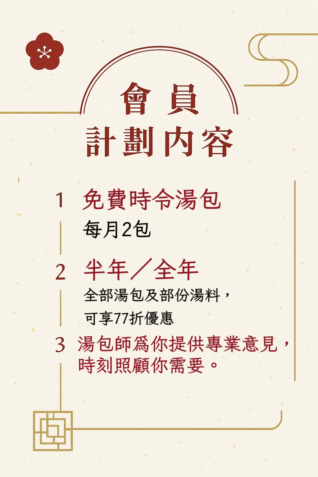識得我地耐既熟客都知道我地農曆12月會轉野玩,因為我地咁多年既宗旨都係為大家身體和心靈健康既產品,身體健康就係湯包🥣,心靈健康就係蘭花喇💐,所以今年早小小比個優惠大家,儲定貨過年💪,亦都可以比充足既時間我地預備靚靚蘭花✌️。 一年一度既新年早鳥優惠又來了,立即加入我地付費會員制,計劃著數多蘿蘿: •送專業湯包咨詢師全天候按你家人的體質度身定造的湯包程序。 •全年,每月兩包時令湯包,共24包(每月23號至月尾送出,只限自取或運費到付) •全年享有會員專屬77折購買全店湯包及部分湯料食材。(只限自取或運費到付) 想一次過俾年費就只需$688,計埋每個月都只係57蚊左右,如果唔想一次過俾一年既話可以選擇半年plan,只係$468,每月都係$78。一包湯都唔止呢個價啦,仲要有購物77折優惠,真係抵到爛!! 上年join左我地會員既客人好多都覺得物超所值,知道我地既湯包真材實料,唔會因為平左或者係月送既湯包而質素差同份量少。上年錯過左既朋友,今年唔好錯過喇,各位快啲黎join啦! 現在一經付款升級全年會籍,我們將在24小時內以68283048 Whasapp聯絡閣下核實資料,順頌吉祥,謝謝!🙏 截止時間:2027年1月18日。