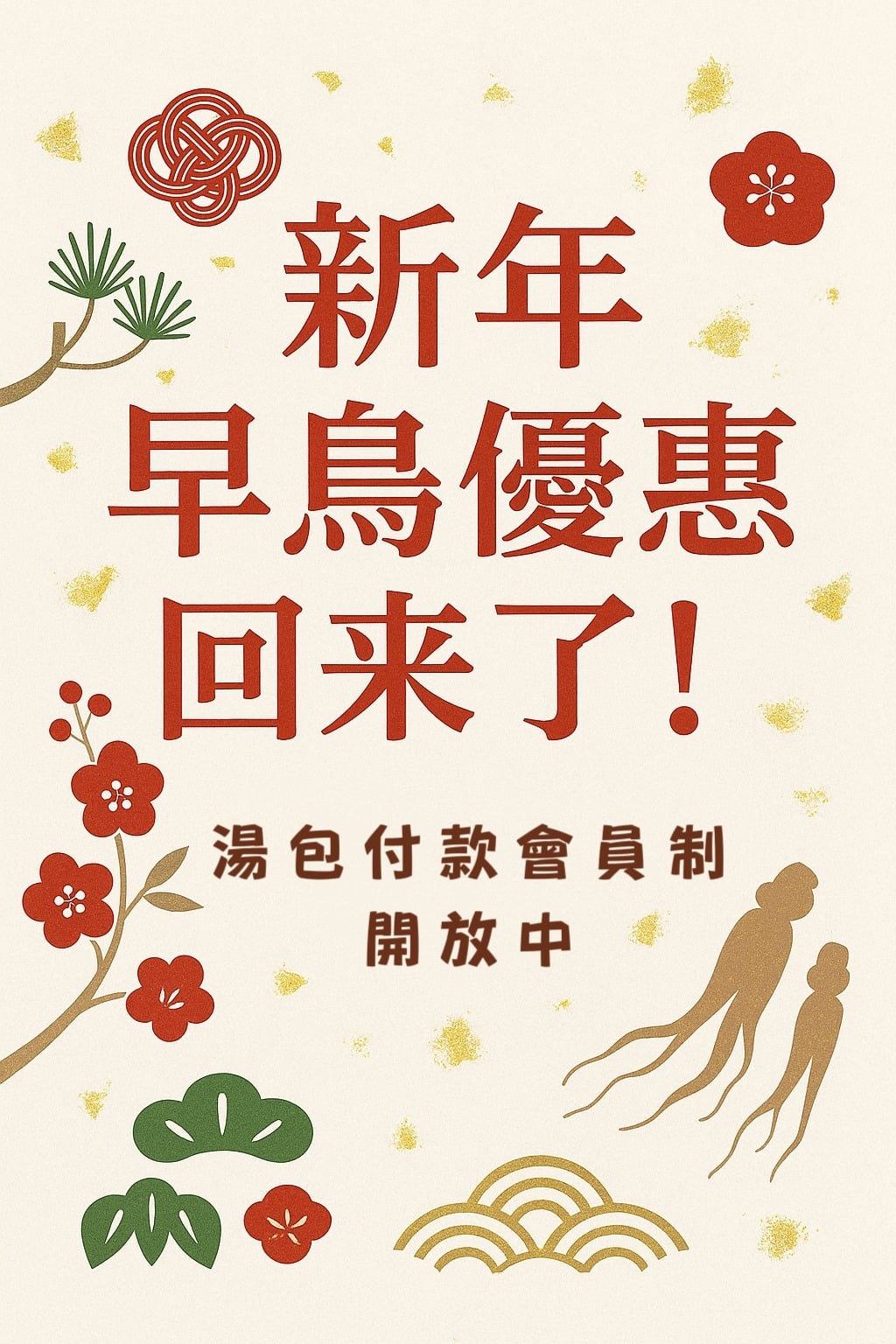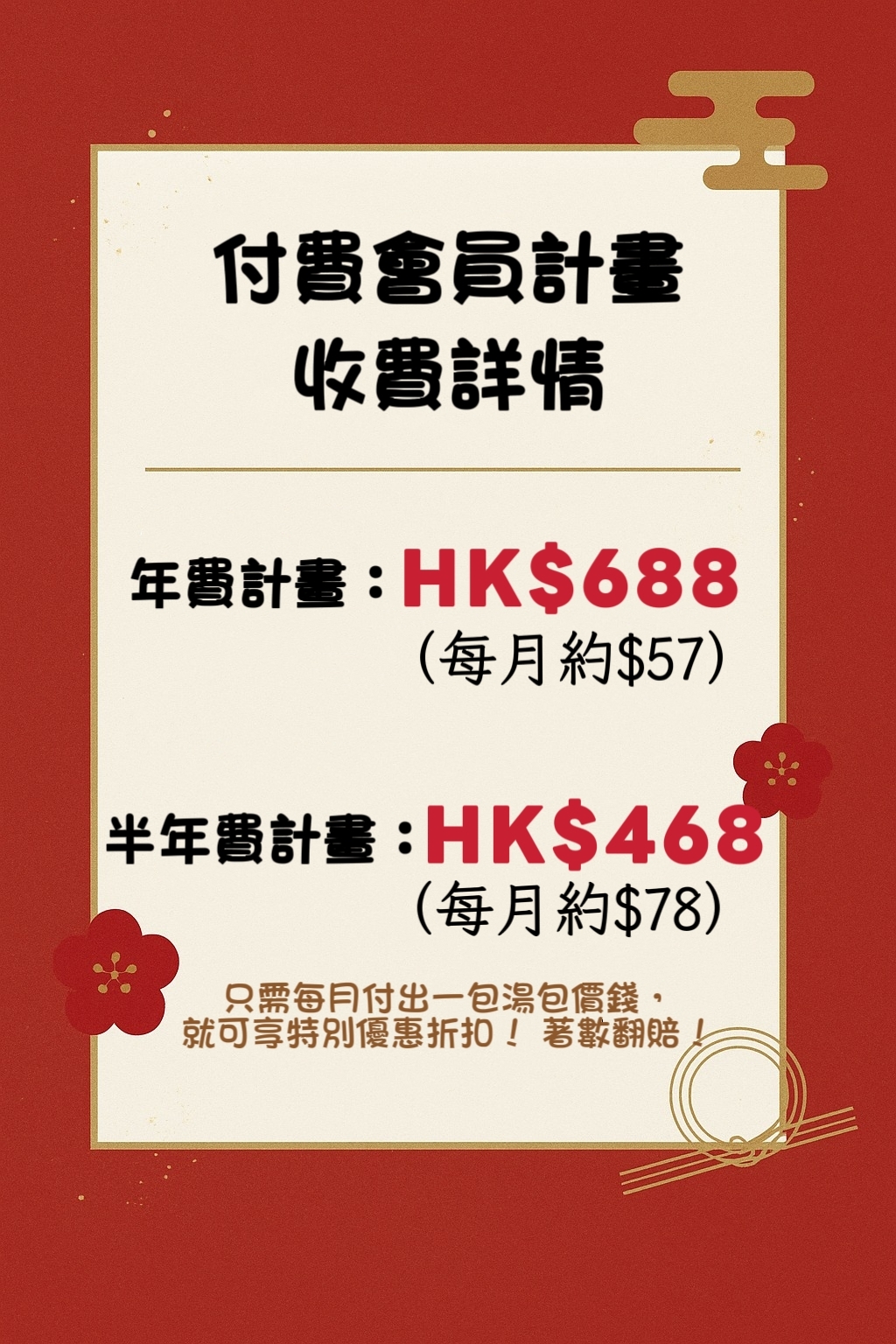 識得我地耐既熟客都知道我地農曆12月會轉野玩,因為我地咁多年既宗旨都係為大家身體和心靈健康既產品,身體健康就係湯包🥣,心靈健康就係蘭花喇💐,所以今年早小小比個優惠大家,儲定貨過年💪,亦都可以比充足既時間我地預備靚靚蘭花✌️。 一年一度既新年早鳥優惠又來了,立即加入我地付費會員制,計劃著數多蘿蘿: •送專業湯包咨詢師全天候按你家人的體質度身定造的湯包程序。 •半年享每月兩包時令湯包,共12包(每月23號至月尾送出,只限自取或運費到付) •半年享有會員專屬77折購買全店湯包及部分湯料食材。(只限自取或運費到付) 想一次過俾年費就只需$688,計埋每個月都只係57蚊左右,如果唔想一次過俾一年既話可以選擇半年plan,只係$468,每月都係$78。一包湯都唔止呢個價啦,仲要有購物77折優惠,真係抵到爛!! 上年join左我地會員既客人好多都覺得物超所值,知道我地既湯包真材實料,唔會因為平左或者係月送既湯包而質素差同份量少。上年錯過左既朋友,今年唔好錯過喇,各位快啲黎join啦! 現在一經付款升級半年會籍,我們將在24小時內以68283048 Whasapp聯絡閣下核實資料,順頌吉祥,謝謝!🙏 截止時間:2027年1月18日。