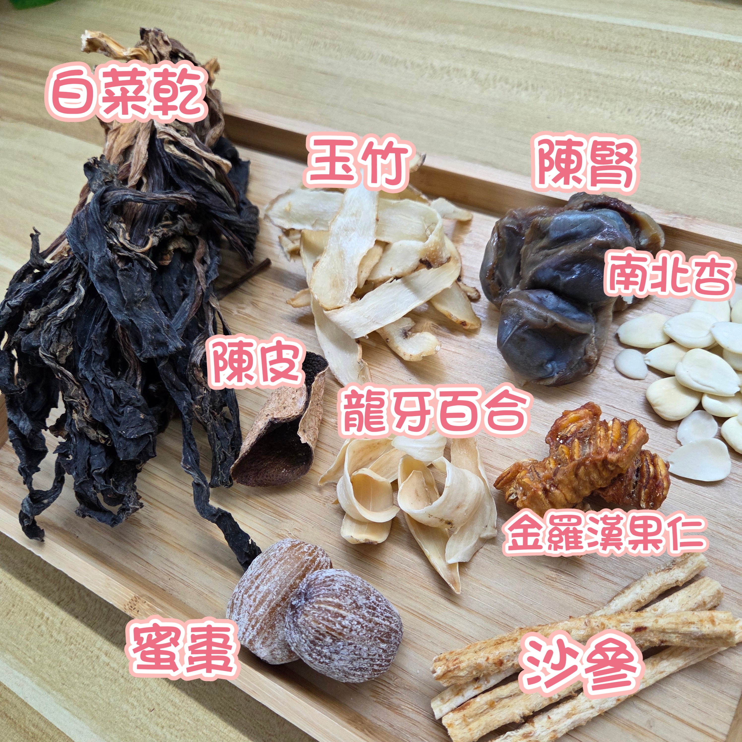 【功效】生津潤肺、清熱除痰、燥熱咳嗽、病後滋補 【材料】菜乾、陳腎、沙參、玉竹、龍王南杏、北杏、羅漢果仁、蜜棗、陳皮 【詳細功效】 菜乾:清熱除煩、潤肺除痰、通利腸胃等功效。 陳腎:養胃生津、消食健脾、潤肺祛燥的作用。 北沙參:清熱養陰,潤肺止咳。主治氣管炎,百日咳,肺熱咳嗽,咯痰黃稠。 玉竹:養陰潤燥,生津止渴。用於肺胃陰傷,燥熱咳嗽,咽干口渴,內熱消渴。 龍王南杏:潤肺、止咳及平喘,亦可生津開胃。 光北杏:祛痰止咳,平喘,潤腸。治外感咳嗽,喘滿,喉痹,腸燥便秘。 龍牙百合:養陰潤肺,清心安神。用於陰虛久咳,痰中帶血,虛煩驚悸,失眠多夢,精神恍惚。 羅漢果仁: 舒緩聲沙喉嚨痛、化痰止咳、清熱潤肺。 蜜棗:補益脾胃、潤肺除痰、滋養陰血、養心安神、緩和藥性。 陳皮:理氣健脾,燥濕化痰。用於胸脘脹滿,食少吐瀉,咳嗽痰多。